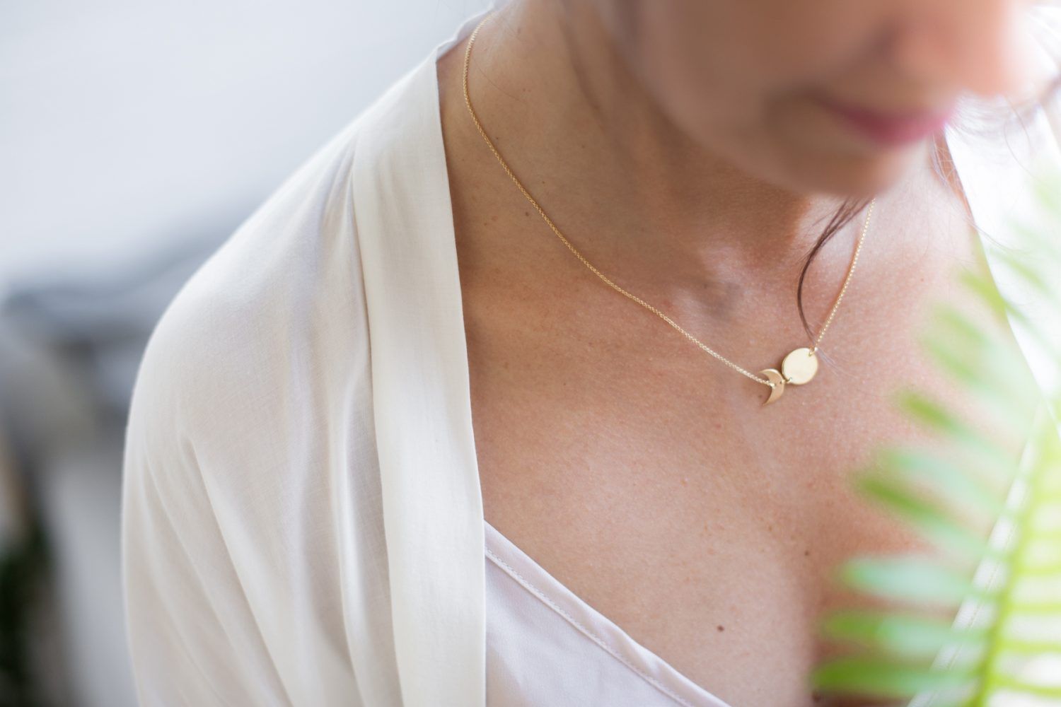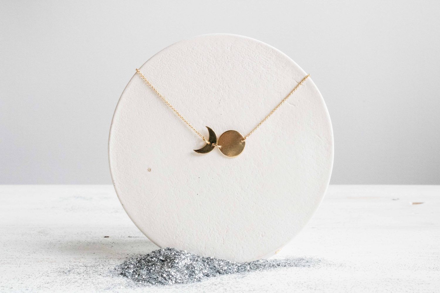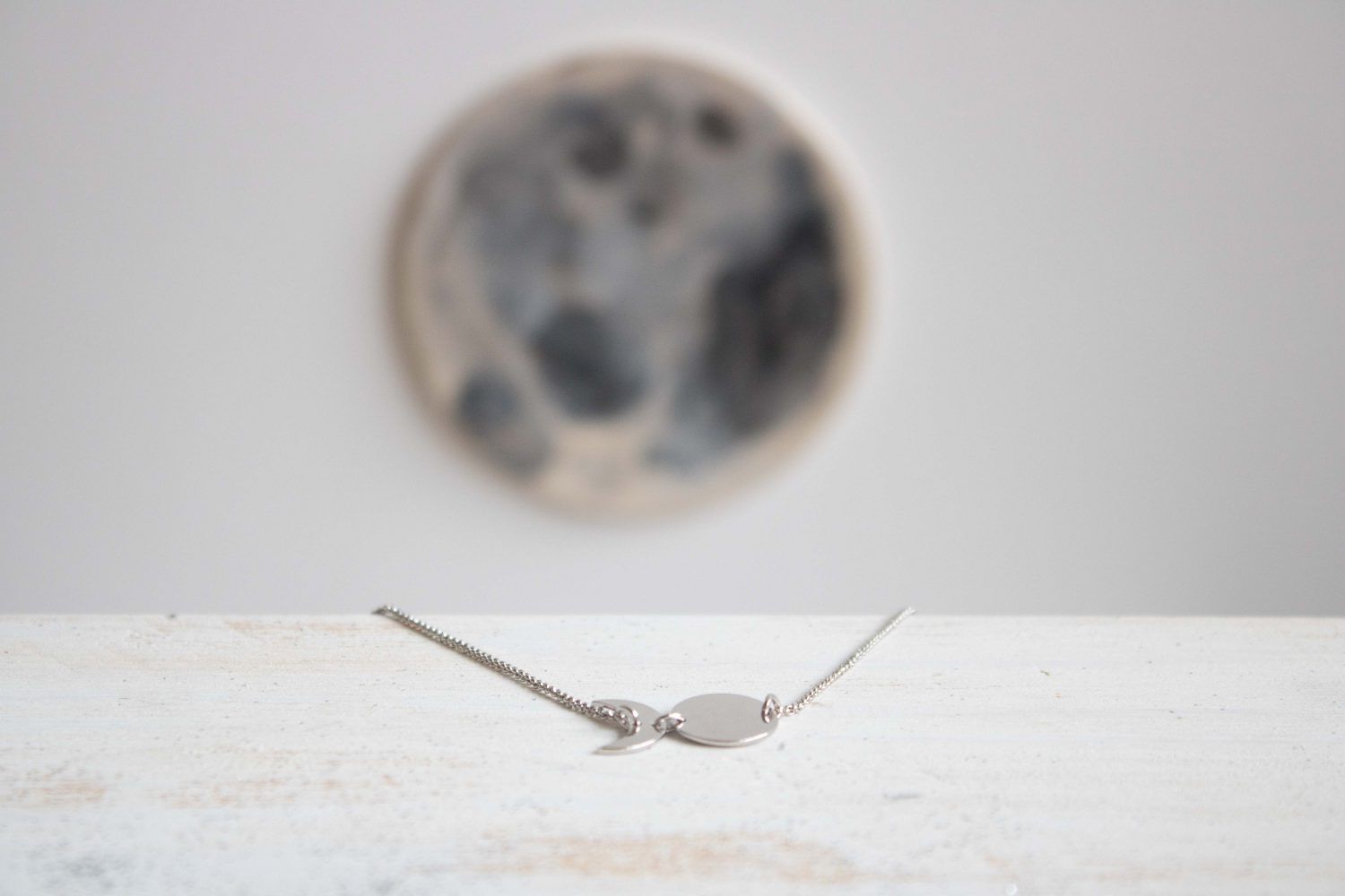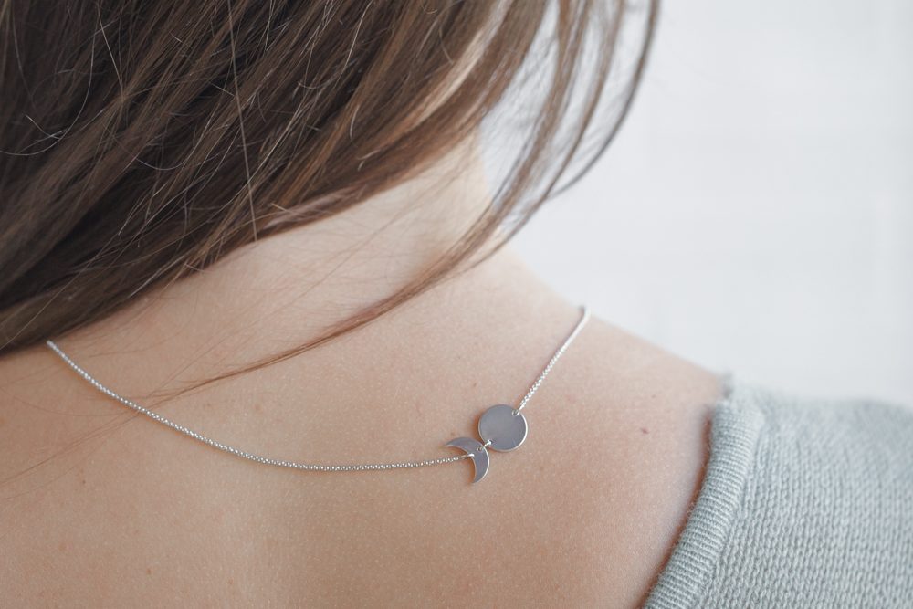 Estos collares están fabricados íntegramente en Barcelona, desde la fabricación de la fornitura a los procesos de montaje, pulido y chapado. Las lunas de este collar miden 11mm y van montadas sobre una cadena de 46cm de largo. Este collar está disponible en Plata 925 o en Latón chapado en oro 18kt.
