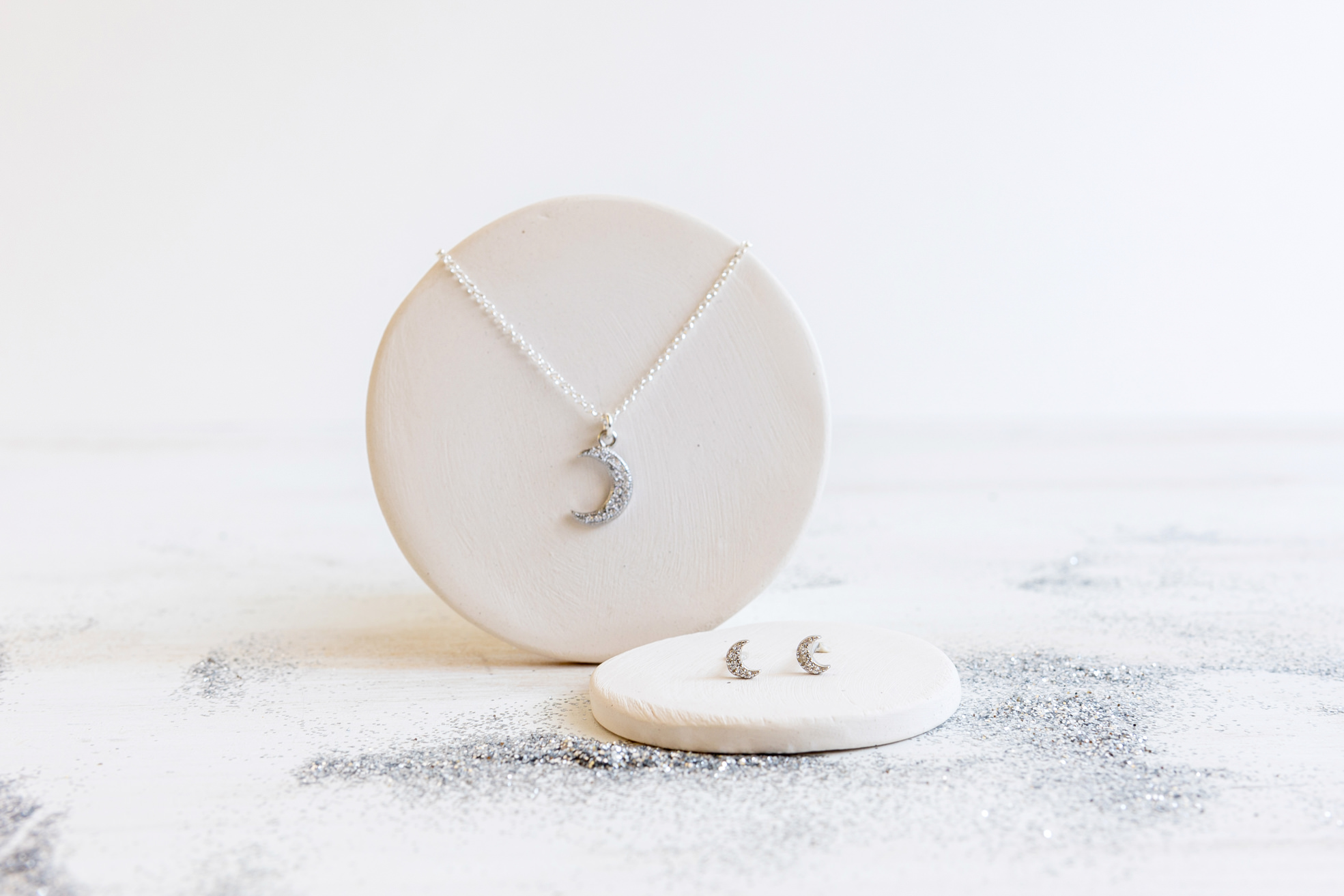 Luna de plata cubierta de estrellas, Nocturna es una pieza sencilla y llena de luz, elaborada en Plata 925 que es el metal asociado a lo femenino y pequeñas circonitas que brillan como pequeñas estrellas en mitad de la noche.