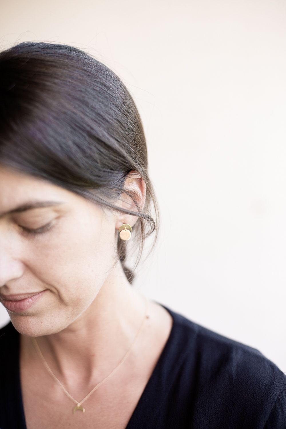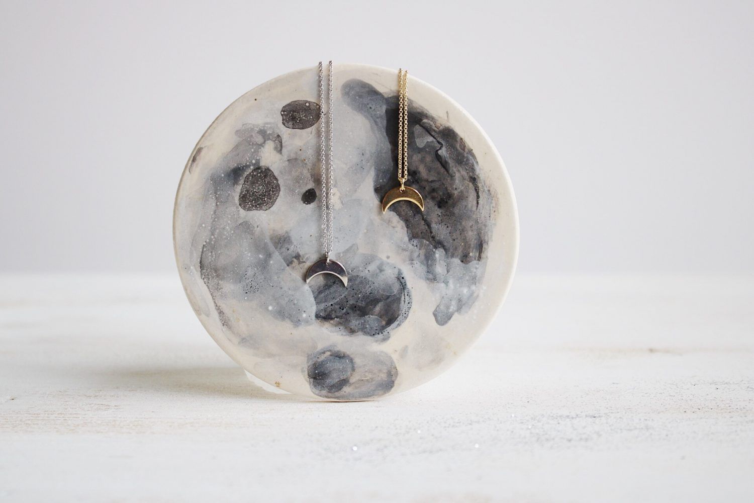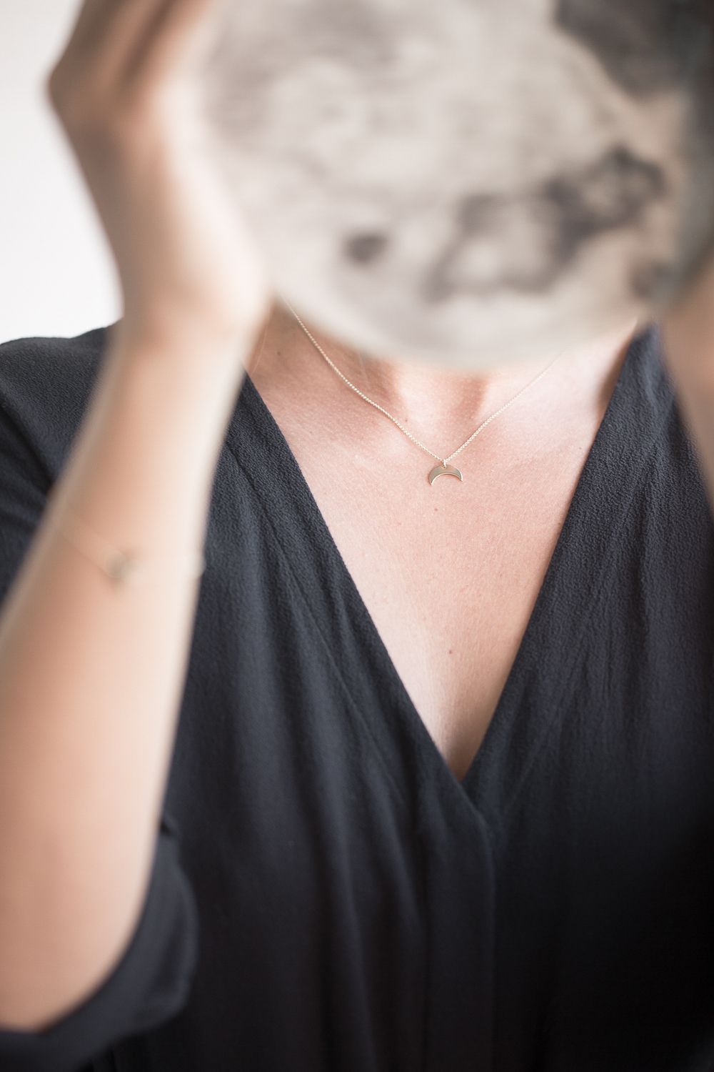 La luna mide 11mm y va montada sobre una cadena de 42cm de largo. Cada pieza se fabrica expresamente en un taller de Barcelona. Los procesos de pulido, montaje y chapado también se realizan con proveedores locales. Este collar está disponible en Plata 925 o en Latón chapado en oro 18kt.